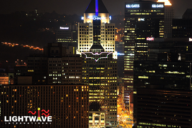 To welcome director Christopher Nolan and the cast and crew of the new film “The Dark Knight Rises” to the city of Pittsburgh, Lightwave International was called upon to project the symbol of the caped crusader on the city skyline.
