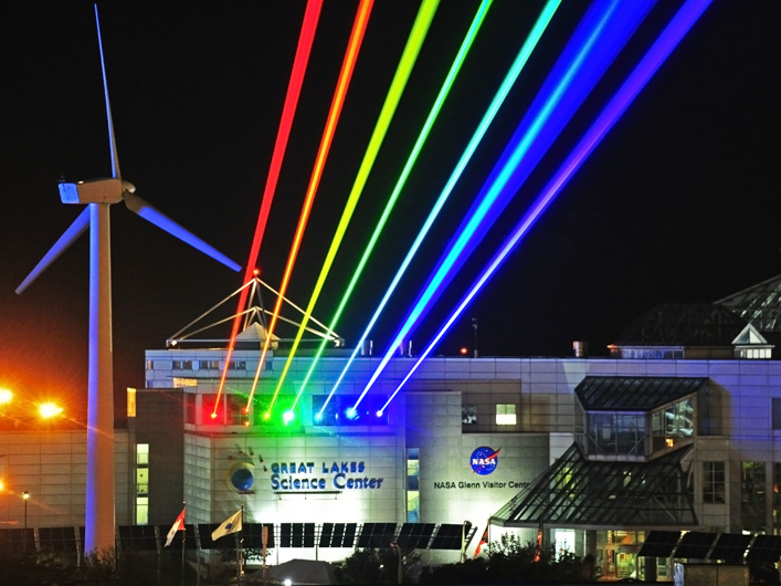 Yvette Mattern’s Global Rainbow returns to the United States in Cleveland, OH. From August 6 to 10 the stunning laser artwork will project from the roof of the Great Lakes Science Center directly over the city of Cleveland. This particular presentation coincides with AHA! Cleveland, “a multi-day festival of lights celebrating Cleveland’s recent downtown development boom…”