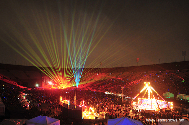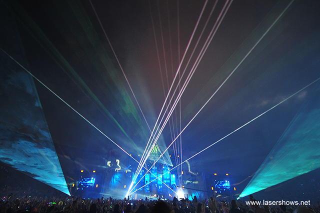 Lightwave laser lighting was used when the sun went down, dazzling main-stage audience members and drawing density to the crowd. Six full-color lasers (four on stage, two at delay tower locations) totaling 64W of output power were used. Control was done by a live operator on a full-size grandMA unit with Lightwave Laser Servers.