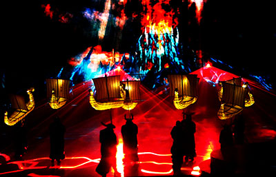 Lightwave’s lasers are used to create a variety of special effects and environments, from underwater seascapes to the fiery dwelling of a dragon’s lair. During the show, they utilize a special cable system to travel to different locations creating effects specifically where needed. The entire system is DMX controlled via the main lighting board.