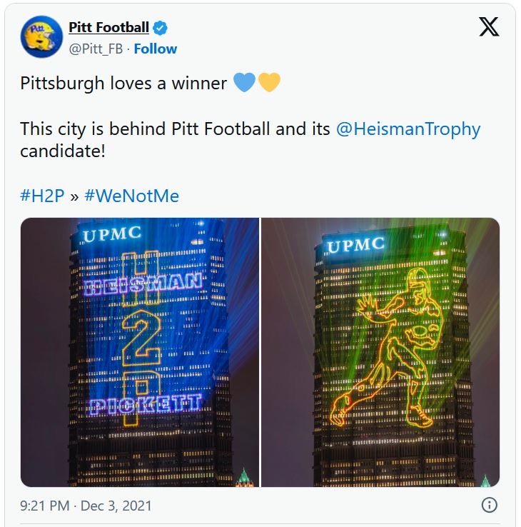 This city is behind Pitt Football and its @HeismanTrophy candidate!#H2P » #WeNotMe pic.twitter.com/IjwcrNifl3
