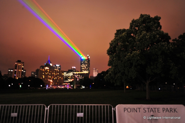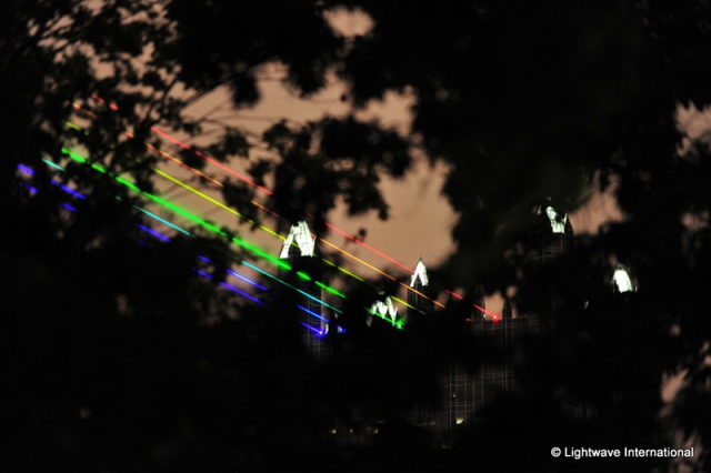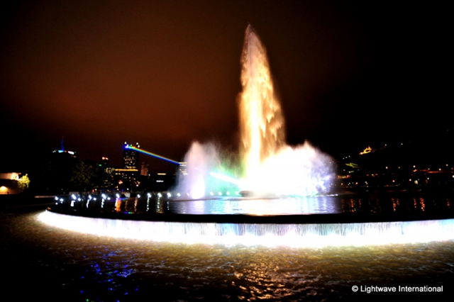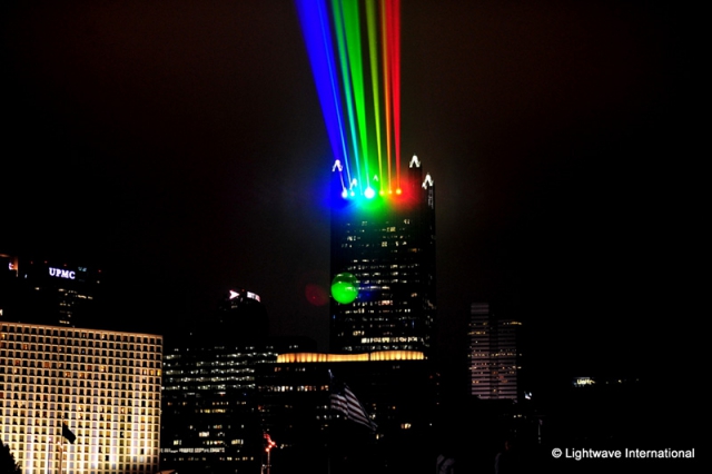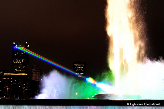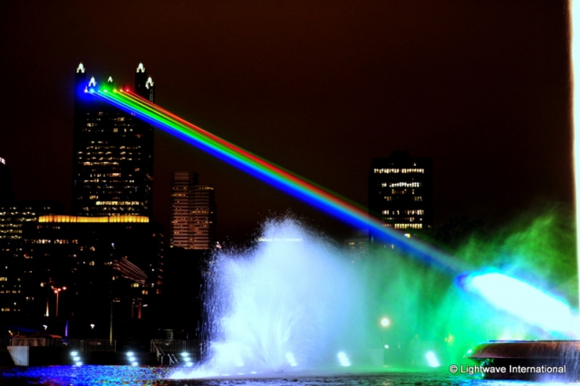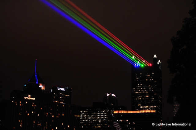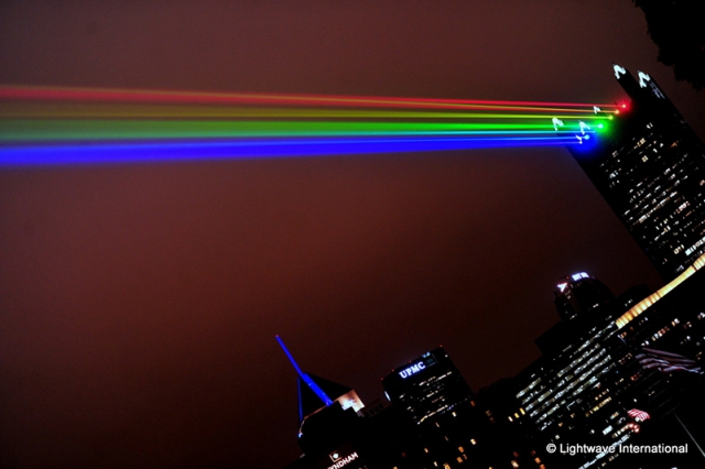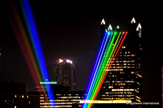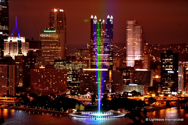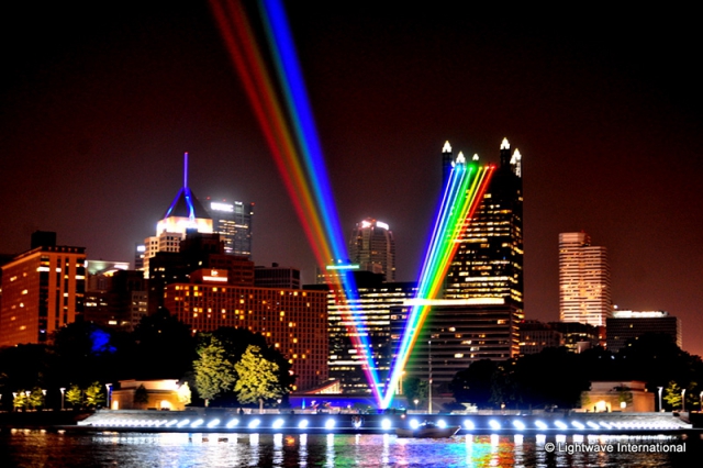 On June 7, 2013 Pittsburgh’s Point State Park fountain rejoined the skyline with the help of Yvette Mattern and Lightwave International. The 150-foot water spout – symbolic of Pittsburgh the way the Gateway Arch identifies St. Louis or the Golden Gate Bridge means San Francisco – has been shut down the past four years for refurbishing. To celebrate the return of the iconic fountain, a stunning array of rainbow laser light physically connects the fountain with PPG Place, the crown jewel of Pittsburgh’s skyline. Lightwave International was chosen by Riverlife and the Pittsburgh Cultural Trust to punctuate this important moment in city history. The laser display lasts three nights and also kicks off the Three Rivers Arts Festival.